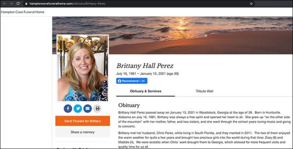 An obituary featured online by an Alabama-based funeral home for Atlanta resident Brittany Hall Perez, 39, states she died on January 13, corroborated by a GoFundMe fundraiser with the same information.